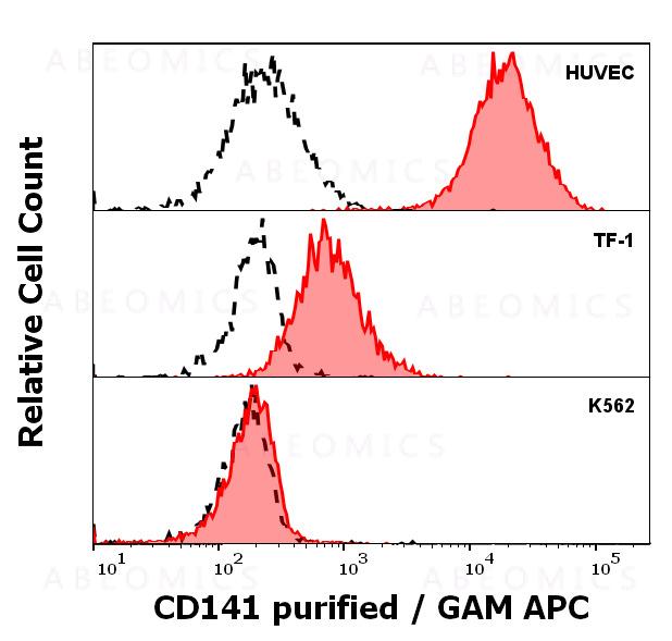 Figure 1: Anti-Hu CD141 purified antibody (clone M80) specificity verification by flow cytometry Anti-Hu CD141 purified antibody (concentration in sample 0.3 μg/ml, GAM APC, red-filled histogram) binds specifically to CD141 on surface of HUVEC cells with high expression of CD141 (upper panel) and also TF-1 cells with lower CD141 expresion (middle panel), but not to surface of K562 cells non-expressing CD141 (lower panel). Level of non-specific binding was assessed using cells unstained by primary antibody (GAM APC, black-dashed histogram).