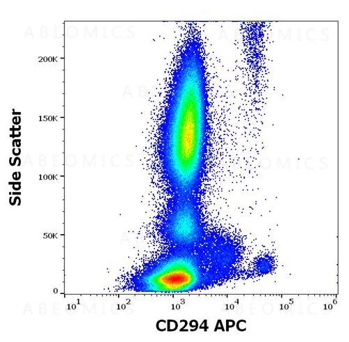 CD294 (prostaglandin D2 receptor 2) is a G-protein-coupled receptor that is preferentially expressed in CD4+ effector T helper 2 (Th2) cells, but also on eosinophils and basophils. It mediates the pro-inflammatory chemotaxis of eosinophils, basophils, and Th2 lymphocytes generated during allergic inflammation. Single nucleotide polymorphisms in the 3' UTR of CD294 gene have been associated with asthma susceptibility. Outside the immune system CD294 is expressed e.g. in gut, heart, and brain. The intracellular C terminal tail contains sites for phosphorylation by protein kinase C.
