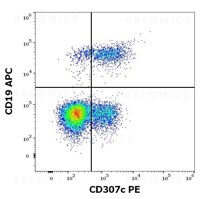 Figure : Flow cytometry multicolor surface staining of human lymphocytes stained using anti-human CD307c (H5) PE antibody (10 μl reagent / 100 μl of peripheral whole blood) and CD19 (LT19) APC antibody (4 μl reagent / 100 μl of peripheral whole blood).
