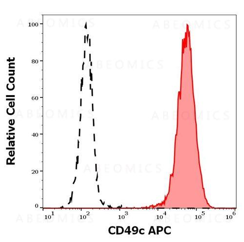 Figure 1: Separation of HeLa cells stained using anti-human CD49c (ASC-1) APC antibody (10 μl reagent per million cells in 100 μl of cell suspension, red-filled) from HeLa cells stained using mouse IgG1 isotype control (MOPC-21) APC antibody (concentration in sample 1.67 μg/ml, same as CD49c APC concentration, black-dashed) in flow cytometry analysis (surface staining).