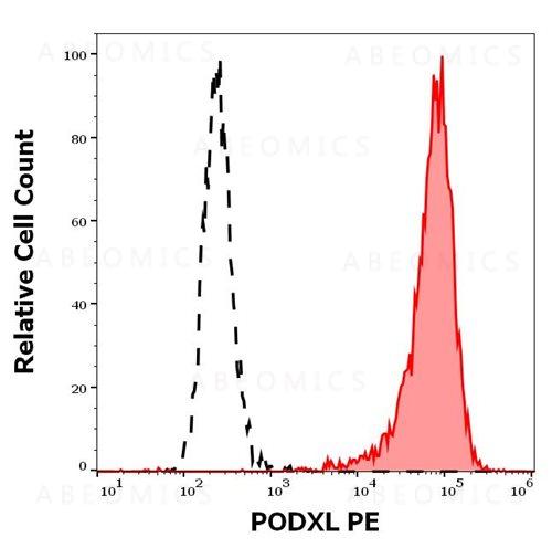 Figure 1: Separation of HeLa cells stained using anti-human PODXL (PcMab-47) PE antibody (red-filled) from HeLa cells stained using mouse IgG1 isotype control (MOPC-21) PE antibody (black-dashed) in flow cytometry analysis (surface staining).