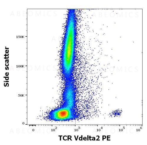 The mouse monoclonal antibody B6 recognizes an extracellular epitope of human TCR Vdelta2, which is expressed on the majority of gamma/delta T cells. TCR Vdelta2 is a variant of TCR delta chain, that is present on a major subset of human gamma/delta T cells. TCR Vgamma9/Vdelta2 (or Vgamma2/Vdelta2) T cells are able to recognize and kill various tumor cells, as this receptor heterodimer binds to certain phosphoantigens, expressed by tumors. They can recognize these antigens in an MHC-unrestricted manner. Similarly to NK cells, Vdelta2 T cells express MHC I receptors and killer Ig-like receptors, that are involved in tumor recognition and cytolysis. The potently cytotoxic subset of them is identified by cell surface expression of polysialyated CD56.