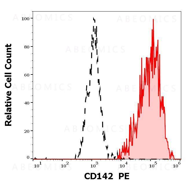 Figure 1 : Separation of A-431 cells stained using anti-CD142 (HTF-1) PE antibody (concentration in sample 5 µg/ml, red-filled) from A-431 unstained cells (black-dashed) in flow cytometry analysis (intracellular staining).