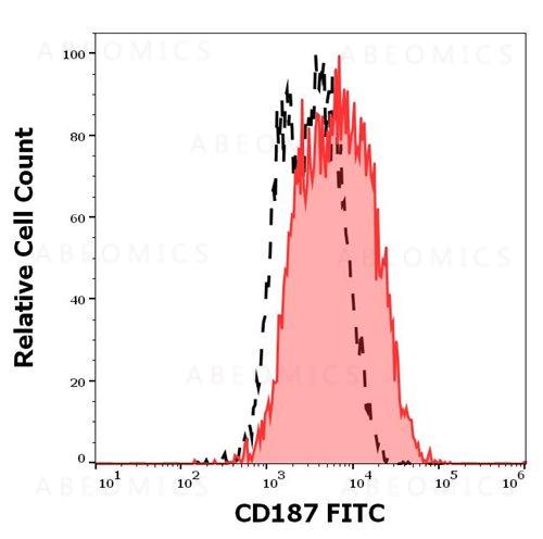 Figure 1: Separation of MCF-7 cells stained using anti-human CD187 (10D1-J16) FITC antibody (4 μl reagent per million cells in 100 μl of cell suspension, red-filled) from MCF-7 cells stained using mouse IgG2b isotype control (MPC-11) FITC antibody (concentration in sample 10 μg/ml, same as CD187 FITC concentration, black-dashed) in flow cytometry analysis (surface staining) of MCF-7 cell suspension.