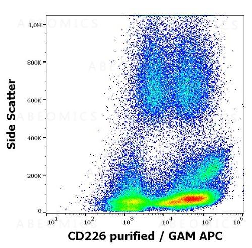 Figure 1:Flow cytometry surface staining pattern of human peripheral whole blood stained using anti-human CD226 (11A8) purified antibody (concentration in sample 0,56 μg/ml, GAM APC).