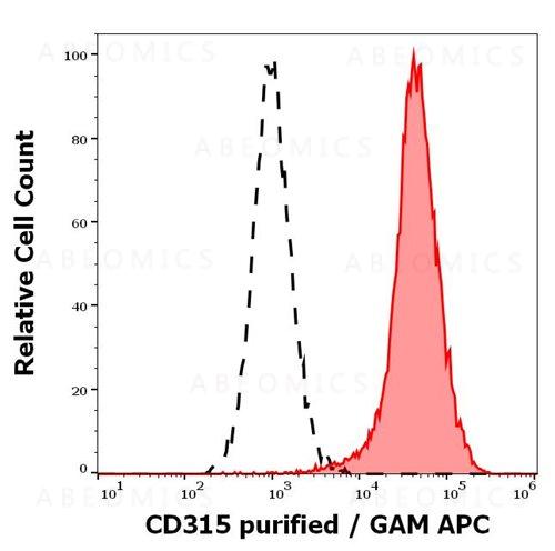 Fig 1: Separation of A431 cells stained using anti-human CD315 (1F11) purified antibody (concentration in sample 1.67 μg/ml, GAM APC) from A431 cells unstained by primary antibody (GAM APC, black-dashed) in flow cytometry analysis (surface staining).