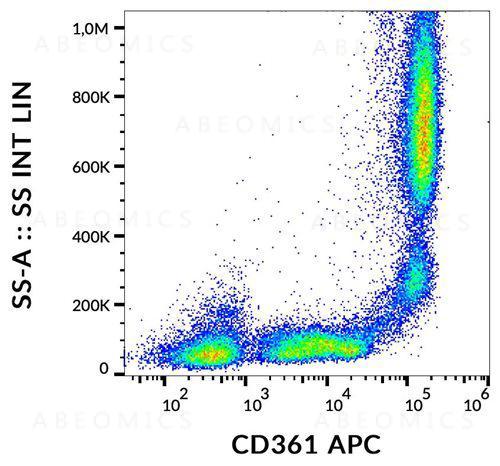 Figure 1 : Flow cytometry analysis (surface staining) of human peripheral blood using anti-CD361 antibody (MEM-216) APC.