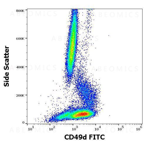 Specificity : The mouse monoclonal antibody 9F10 recognizes an extracellular epitope of CD49d (alpha 4 integrin), a 145-180 kDa type I transmembrane glycoprotein expressed on B and T cells, monocytes, eosinophils, basophils, NK cells, and dendritic cells, but not platelets.