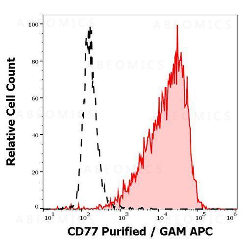 Figure 1 : Separation of RAJI cells stained anti-human CD77 (38.13) Purified antibody (concentration in sample 1,67 µg/ml, GAR Alexa Fluor® 647, red-filled) from RAJI cells unstained by primary antibody (GAR Alexa Fluor® 647, black-dashed) in flow cytometry analysis (surface staining) of RAJI cell suspension.