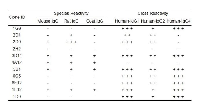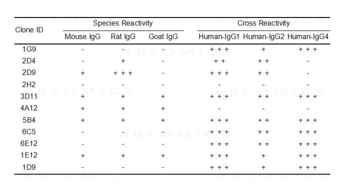 Figure 1. ELISA examination of rabbit anti-human IgG mAbs binding to immunogolobulins of different species and isotypes.