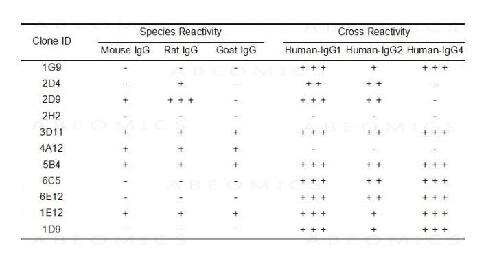 Figure 1. ELISA examination of rabbit anti-human IgG mAbs binding to immunogolobulins of different species and isotypes.