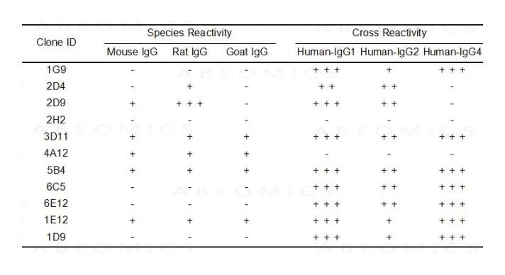 Figure 1. ELISA examination of rabbit anti-human IgG mAbs binding to immunogolobulins of different species and isotypes.