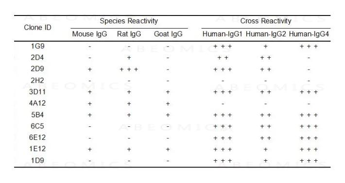 Figure 1. ELISA examination of rabbit anti-human IgG mAbs binding to immunogolobulins of different species and isotypes.