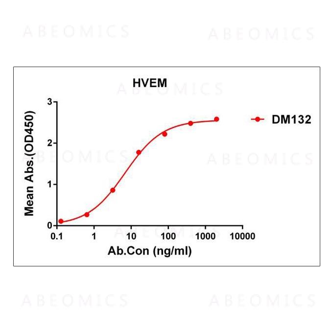 Figure 1. ELISA plate pre-coated by 1 μg/ml (100 μl/well) Human HVEM protein, His tagged protein can bind Rabbit anti-HVEM monoclonal antibody(clone: DM132) in a linear range of 0. 1-12 ng/ml.