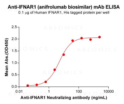 Figure 1. ELISA plate pre-coated by 1 μg/mL (100 μL/well) Human IFNAR1 Protein, His Tag can bind Anti-IFNAR1 Neutralizing antibody in a linear range of 0.61-39.06 ng/mL.