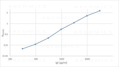 Description: Immunoglobulin E (IgE) is a 180 kDa soluble protein serving as an antigen-specific unit of mast cell effector mechanisms. IgE has the lowest serum concentration of all immunoglobulins (approximately 0.5 mg/l) in healthy individuals, but upon allergen challenge its concentration in blood increases dramatically. Although biological survival of free IgE is very short (T1/2 = 2 days), it is stabilized after binding to its high affinity receptor. Unlike IgM- IgG- and IgA-committed B cells, IgE-switched B cells do not undergo clonal expansion.