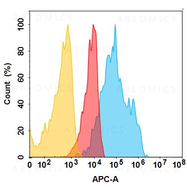 Figure 1. IGF-1R protein is highly expressed on the surface of Expi293 cell membrane. Flow cytometry analysis with 1μg/mL Anti-IGF-1R(teprotumumab biosimilar) mAb on Expi293 cells transfected with human IGF-1R (Blue histogram) or Expi293 transfected with irrelevant protein (Red histogram),and Isotype antibody on Expi293 transfected with irrelevant protein (Orange histogram).