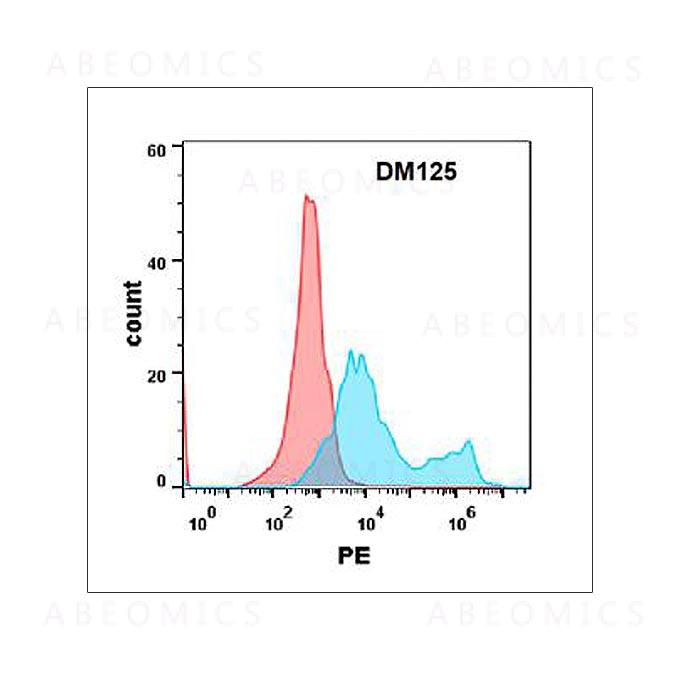Figure 1. Flow cytometry analysis with Anti-IL-17RA (DM125) on Expi293 cells transfected with human IL17RA (Blue histogram)or Expi293 transfected with irrelevant protein (Red histogram).