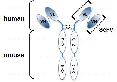 Figure 1: Structure of the recombinant antibody anti-IL-33 (mouse), mAb (rec.) (blocking) (Bondy-1-1) (preservative free) . The single chain variable human fragment (ScFv) selected by antibody phage display technology and specific to the antigen of interest is fused to a mouse IgG2b Fc region.