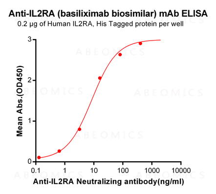 Figure-1: ELISA plate pre-coated by 2 µg/ml (100 µl/well) Human IL2RA, His tagged protein can bind Anti-IL2RA Neutralizing antibody in a linear range of 0.64-400 ng/ml.