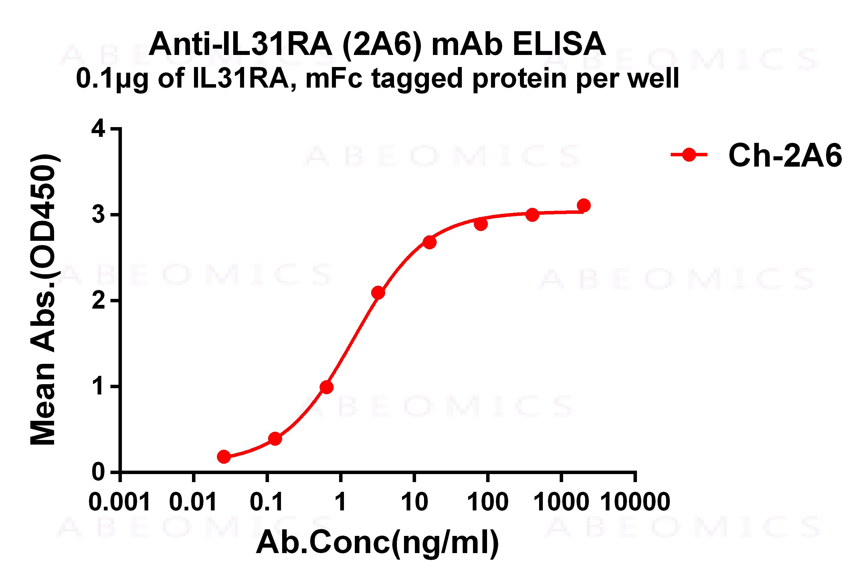 Figure 1. ELISA plate pre-coated by 1 μg/ml (100 μl/well) Human IL31RA, mFc tagged protein can bind Rabbit anti-IL31RA monoclonal antibody(clone: 2A6) in a linear range of 1-10 ng/ml.