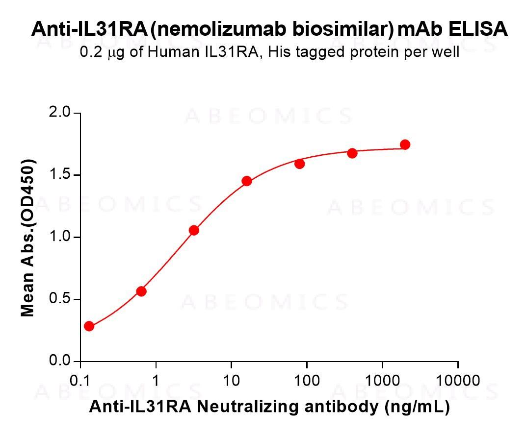 Figure 1. ELISA plate pre-coated by 2 μg/mL (100 μL/well) Human IL31RA Protein, His Tag can bind Anti-IL31RA(nemolizumab biosimilar) mAb (12-90022) in a linear range of 0.13–16 ng/mL.