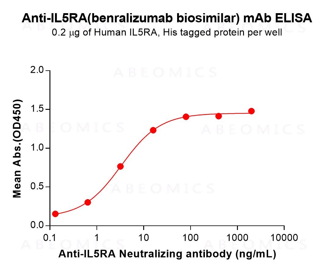Figure 1. ELISA plate pre-coated by 2 μg/mL (100 μL/well) Human IL5RA Protein, His Tag can bind Anti-IL5RA(benralizumab biosimilar) mAb (12-90013) in a linear range of 0.13–16 ng/mL.