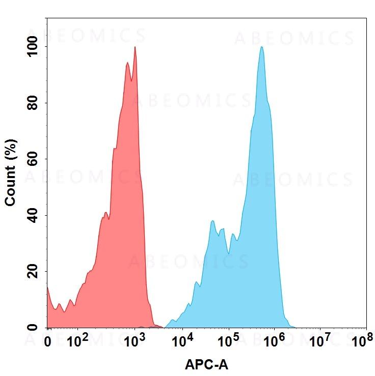 Figure 1. Flow cytometry analysis with 1 μg/mL Anti-IL7RA (lusvertikimab biosimilar) mAb on Expi293 cells transfected with Human IL7RA protein (Blue histogram) or Expi293 transfected with irrelevant protein (Red histogram).