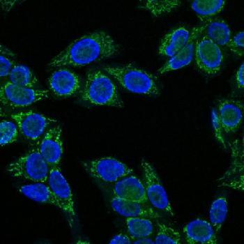 Fig. 1: Immunofluorescence Analysis of HeLa cells labeling IGF-1 with IGF-1 Mouse Monoclonal Antibody (CTC05) labeled with CF647R (Green). Nuclei are counter stained with DAPI (Blue).