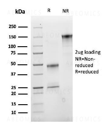 Fig. 1: SDS-PAGE Analysis Purified IGF-1 Mouse Monoclonal Antibody (M23). Confirmation of Purity and Integrity of Antibody.