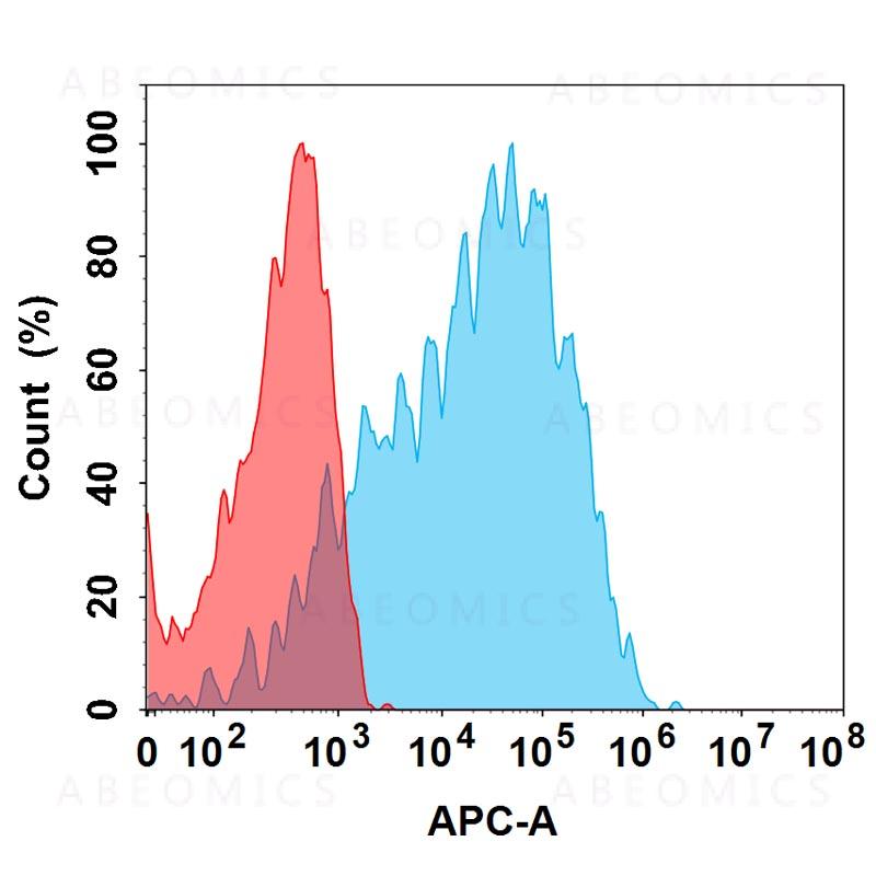 Figure 1. Flow cytometry analysis with 1µg/mL Anti-ITGB6(sigvotatug biosimilar) mAb on Expi293 cells transfected with Human ITGB6&ITGAV protein (Blue histogram) or Expi293 transfected with Human ITGAV protein (Red histogram).
