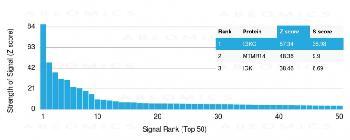 Fig. 1: Analysis of Protein Array containing more than 19,000 full-length human proteins using Kappa Light Chain (IGKC) Mouse Monoclonal Antibody (KLC709). Z- and S- Score: The Z-score represents the strength of a signal that a monoclonal antibody (Monoclonal Antibody) (in combination with a fluorescently-tagged anti-IgG secondary antibody) produces when binding to a particular protein on the HuProtTM array. Z-scores are described in units of standard deviations (SD's) above the mean value of all signals generated on that array. If targets on HuProtTM are arranged in descending order of the Z-score, the S-score is the difference (also in units of SD's) between the Z-score. S-score therefore represents the relative target specificity of a Monoclonal Antibody to its intended target. A Monoclonal Antibody is considered to specific to its intended target, if the Monoclonal Antibody has an S-score of at least 2.5. For example, if a Monoclonal Antibody binds to protein X with a Z-score of 43 and to protein Y with a Z-score of 14, then the S-score for the binding of that Monoclonal Antibody to protein X is equal to 29.
