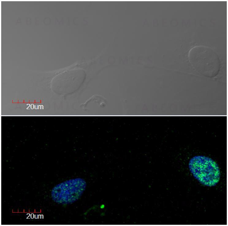 Figure 1: Immunocytochemistry detection of Ki-67 in U2OS cell line (human osteosarcoma) using monoclonal antibody Ki-67 (green). Cell nuclei stained with DAPI (blue).