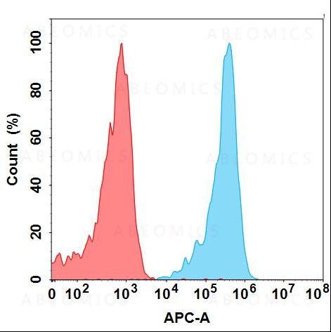 Figure 1. Flow cytometry analysis with 1 μg/mL Anti-KIR2DL2 (lirilumab biosimilar) mAb on Expi293 cells transfected with Human KIR2DL2 protein (Blue histogram) or Expi293 transfected with irrelevant protein (Red histogram).