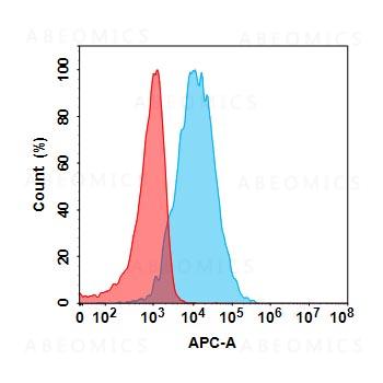 Figure 1. Flow cytometry analysis with 1μg/mL Anti-KLRG1(ulviprubart biosimilar) mAb on Expi293 cells transfected with Human KLRG1 protein (Blue histogram) or Expi293 transfected with irrelevant protein (Red histogram).