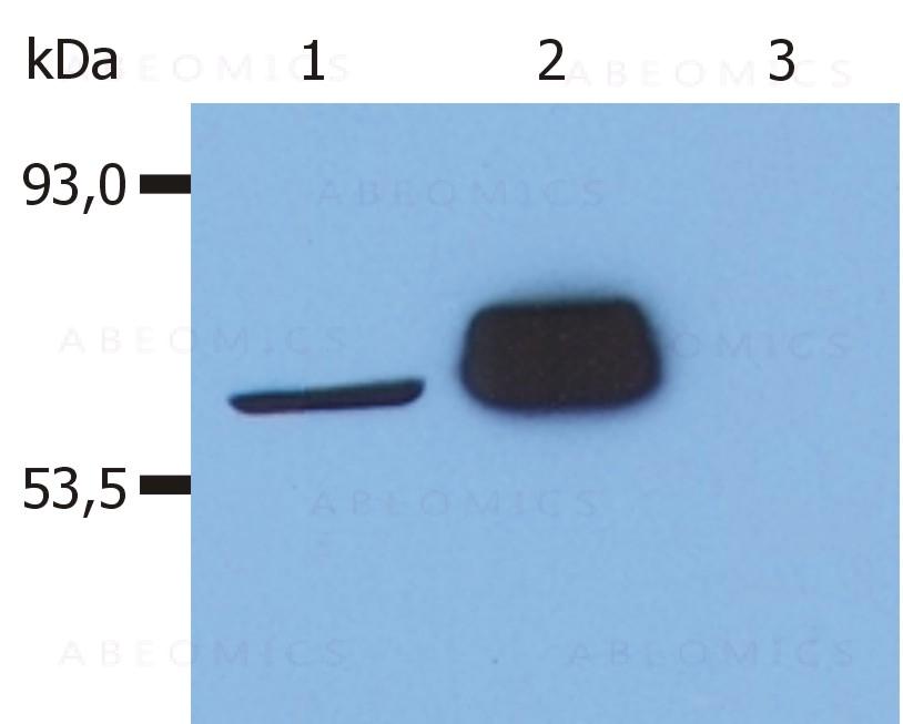 Figure 1:Western Blotting analysis (reducing conditions) of human Lck in whole cell lysate using anti-human Lck (LCK-01). Lane 1: J. CaM-1.6 cell line (a mutant derivate of the JURKAT cell line) transfected with Lck. Lane 2: HEK-293T cell line transfected with Lck. Lane 3: HEK-293T cell line (non-transfected)