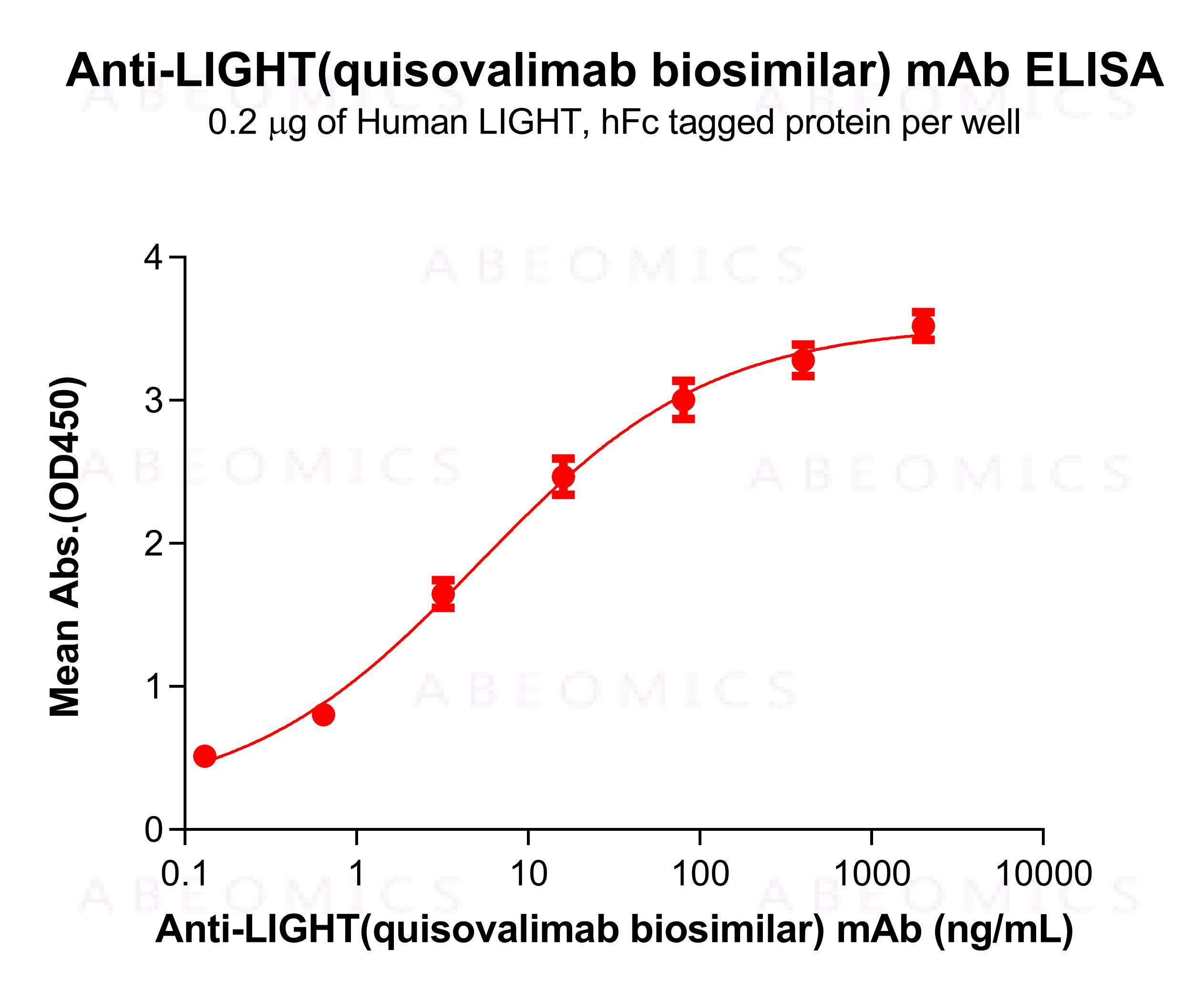Figure 1. ELISA plate pre-coated by 2 μg/mL (100 μL/well) Human LIGHT Protein, hFc Tag can bind Anti-LIGHT(quisovalimab biosimilar) mAb in a linear range of 3.2–16 ng/mL, goat anti-human Fab-specific antibody was used as detection antibody.