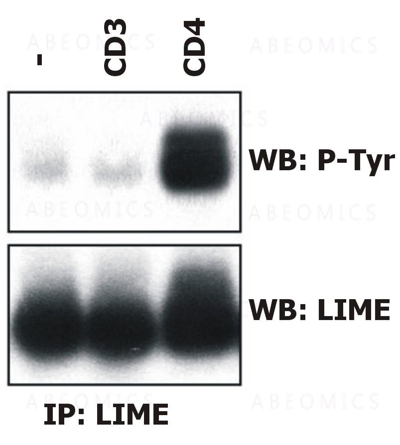 LIME (Lck-interacting molecule) is a 30 kDa double-palmitoylated protein with unusually basic cytoplasmic domain, expressed by T cells. After ligation of CD4 or CD8 T cell coreceptors, LIME is phosphorylated by Src-family kinases and associates with Lck and Fyn kinases and with their negative regulator Csk. Interestingly, Csk-mediated phosphorylation of C-terminal negative-regulatory tyrosine of LIME-associated Lck can result in increase of enzymatic activity compared with the total pool of Lck, thus, LIME serves as a positive regulator of TCR-dependent T cell signaling. However, under some circumstances, LIME may mediate inhibitory signals.