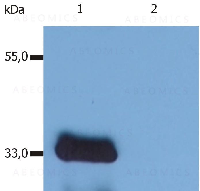 Figure 1: Western Blotting analysis (reducing conditions) of human LIME using anti-human LIME (LIME-10). Lane 1: J77 cell line transfected with LIME. Lane 2: non-transfected J77 cell line (cells are essentialy devoid of endogenous LIME expression)