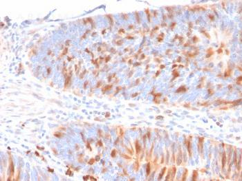 Fig. 1: Formalin-fixed, paraffin-embedded human colon stained with Methyl-CpG Binding Domain Protein 1 Mouse Monoclonal Antibody (CPTC-MBD1-1)
