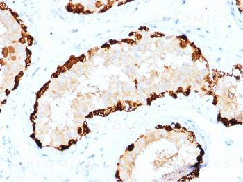 Fig. 1: Formalin-fixed, paraffin-embedded human Testis stained with MAGEA4 Mouse Monoclonal Antibody (CPTC-MAGEA4-1).