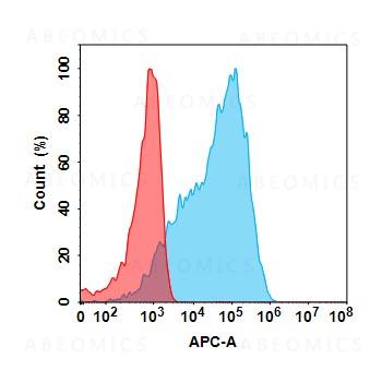 Figure 1. Flow cytometry analysis with 1μg/mL Anti-Mesothelin VHH-human IgG1 Fc on Expi293 cells transfected with Human Mesothelin protein (Blue histogram) or Expi293 transfected with irrelevant protein (Red histogram).