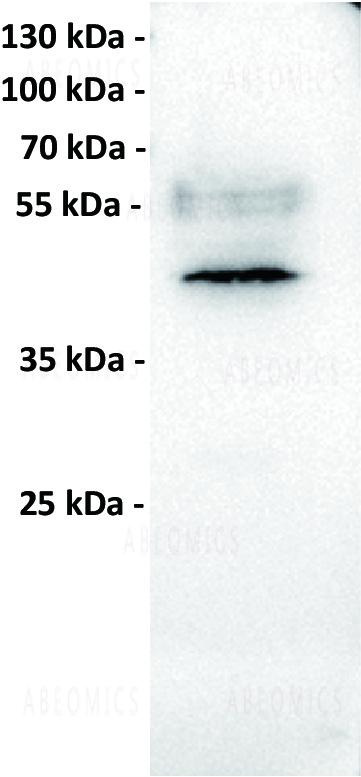 "Figure 1.Anti-MICA antibody (Cat# 12-9617) at 1/1000 dilution Lane : HeLa (human cervical adenocarcinoma epithelial cell), whole cell lysate Secondary : Goat Anti-Rabbit IgG H&L (HRP) at 1/5000 dilution band size: 43 kDa"
