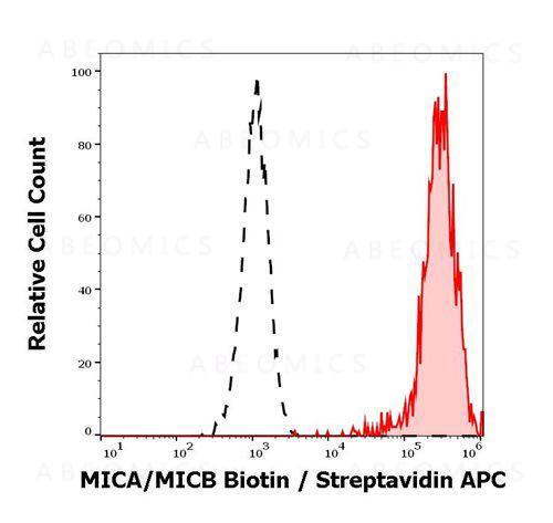 Figure 1 : Separation of Jurkat cells stained using anti-human MICA/MICB (6D4) Biotin antibody (concentration in sample 4 µg/ml, Streptavidin APC, red-filled) from unstained Jurkat cells (Streptavidin APC, black-dashed) in flow cytometry analysis (surface staining).