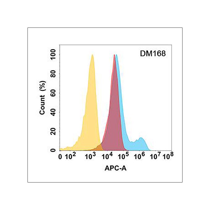 Figure 1. MICB protein is highly expressed on the surface of Expi293 cell membrane. Flow cytometry analysis with Anti-MICB (DM168) on Expi293 cells transfected with human MICB (Blue histogram) or Expi293 transfected with irrelevant protein (Red histogram), and Isotype antibody on Expi293 transfected with irrelevant protein (Orange histogram).