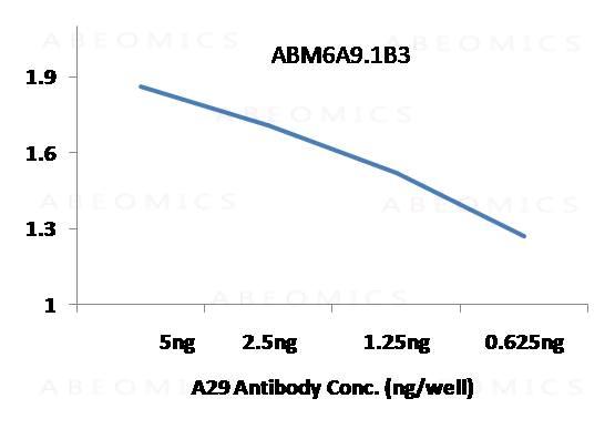 Figure-1: An indirect ELISA is carried out by coating A29 antigen in serial dilution from 5 ng/well to 0.625 ng/well and purified Anti-A29 monoclonal antibodies ABM6A9.1B3 was added at 100ng/well. Peroxidase conjugated Goat-Anti mouse antibody was used at 1:5000 dilution.