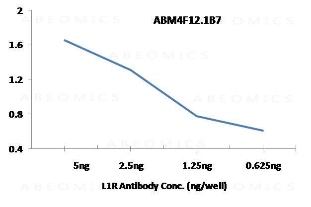 Figure-1: An indirect ELISA is carried out by coating L1R antigen in serial dilution from 5 ng/well to 0.625 ng/well and purified Anti-L1R monoclonal antibodies ABM4F12.1B7 was added at 100ng/well. Peroxidase conjugated Goat-Anti mouse antibody was used at 1:5000 dilution.