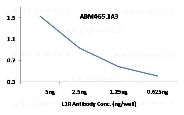Figure-1: An indirect ELISA is carried out by coating L1R antigen in serial dilution from 5 ng/well to 0.625 ng/well and purified Anti-L1R monoclonal antibodies ABM4G5.1A3 was added at 100ng/well. Peroxidase conjugated Goat-Anti mouse antibody was used at 1:5000 dilution.