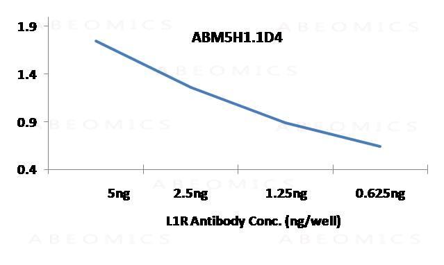 Figure-1: An indirect ELISA is carried out by coating L1R antigen in serial dilution from 5 ng/well to 0.625 ng/well and purified Anti-L1R monoclonal antibodies ABM5H1.1D4 was added at 100ng/well. Peroxidase conjugated Goat-Anti mouse antibody was used at 1:5000 dilution