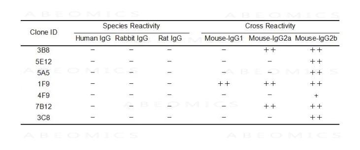 Figure 1. ELISA examination of goat anti-mouse IgG mAbs binding to immunogolobulins of different species and isotypes.